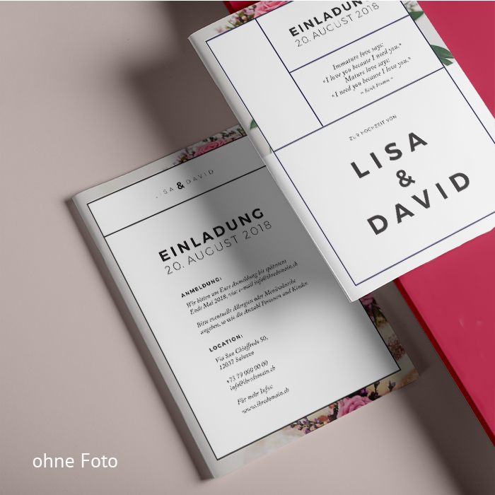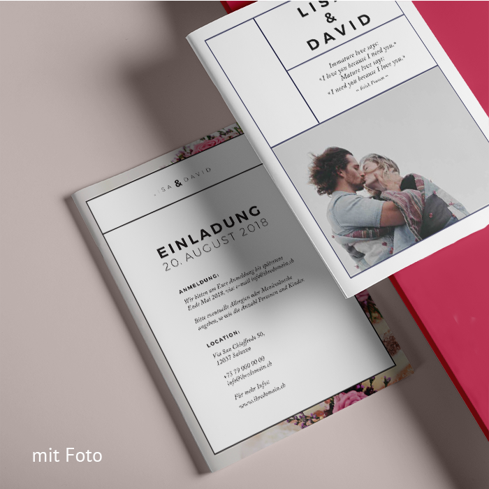 - Text für die Einladung, welcher auf der Karte gedruckt werden soll (z.B. Angaben zur Location, Domain der Hochzeits-Webseite, Informationen zur An- und Abmeldung der Hochzeit usw.)